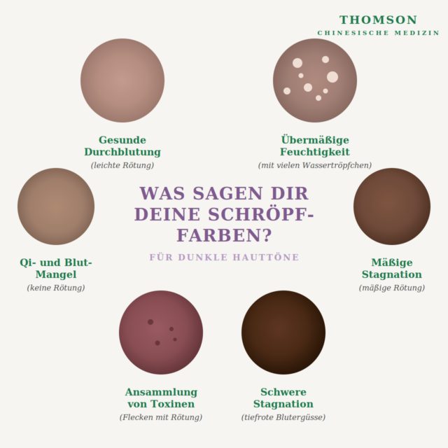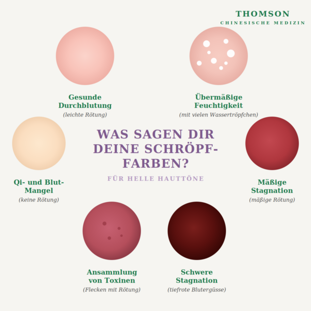 In der Traditionellen Chinesischen Medizin (TCM) gelten die Schröpfmale als sichtbare Hinweise auf die Stärke von Blut- oder Qi-Stagnation, auf Giftstoffansammlungen oder Feuchtigkeit im Körper.
